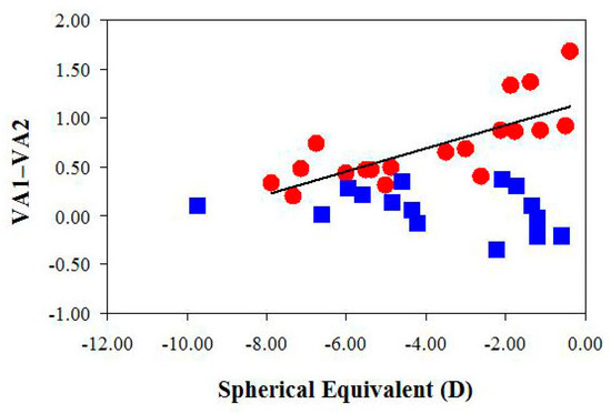 Relationship between VA1–VA2 and refraction for subjects within the BFG (red symbols) and the CG (blue symbols). For the BFG, the line represents the best linear fit (VA1–VA2 = 0.12 ∗ SE + 1.16).