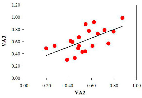VA3 vs. VA2 values for all BF subjects. The black line represents the best linear fit to the data (VA3 = 0.71 ∗ VA2 + 0.23).