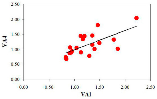 Relationship between VA4 and VA1 for all subjects of the BFG. Best linear fit to the data: VA4 = 0.64 ∗ VA1 + 0.36).