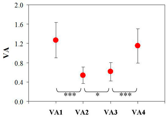 Averaged VA values at every experimental condition for the subjects of BFG. Error bars indicate the standard deviation. (***: p < 0.0001; *: p < 0.01). The time period among VA measurements is the same as in Figure 4.