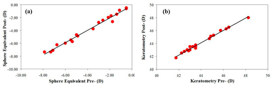 Comparison of spherical equivalent (a) and keratometric values (b) before and after BF wearing (i.e., just subjects from BFG). Black solid lines correspond to the best linear fits (SEpost = 0.96 ∗ SEpre − 0.13 and Kpost = 0.96 ∗ Kpre + 1.91, respectively).