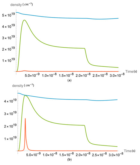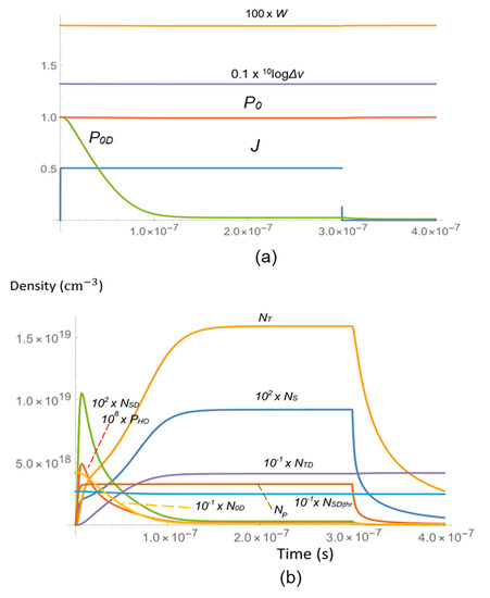 Time evolutions of various quantities for an OLED far below the threshold for lasing. The applied injection current has amplitude 0.5 kA/cm2, and a duration of 300 ns. There is no special cavity arrangement assumed; , corresponding to , , . (a) Current density J in kA/cm2, ground-state probabilities and respectively for host and dopant molecules and the linewidth of the emitted light. (b) Polaron density NP, exciton densities for host and dopant molecules and the photon density PHO. The light blue curve is 10−1 × NSD|thr (see (11); clearly, the maximum of NSD (~ 1017 cm−3) is far below the threshold value (~2.5 × 1019 cm−3).