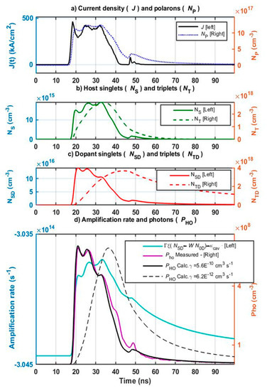 To validate our model, we have confronted our simulation with an experimental analysis of an electrically pumped OLED without a special cavity. In this device, the organic hetero-structure itself defines a residual weak micro-cavity effect (Q ~ 6, κCAV ~ 3.0 × 1014 s−1 and reabsorption fraction W ~ 8%. A 20 ns, 45 V pulse excitation voltage is applied to the OLED and the electrical injection current is measured and recorded together with the emitted light intensity. This measured current is taken as the source term in the polaron rate Equation (1). The exciton and photon densities are then calculated from the set of Equations (1)–(8) with model parameters from Table 1, except for the fitted parameters given in Table 2. The results are plotted in Figure 3, where Figure 3d shows the measured and simulated photon densities in one plot for comparison.