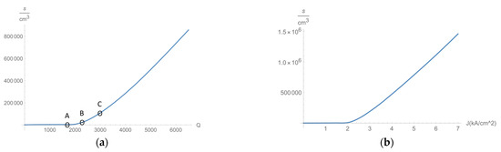 Simulated time-integrated photon density versus (a) the cavity quality factor Q and (b) the applied electrical current density J. In (a) the pump current is 2.0 kA/cm2 and the points A, B, C correspond to the cases of Figure 5a–c, respectively; in (b) the quality factor is 2000 (κCAV ~ 9 × 1011 s−1). The duration of the pulse is 20 ns; the parameter values are for the validated case in Figure 3 and .