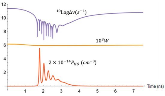 Such a relaxation oscillation is well known to occur in conventional III-V semiconductor lasers and more generally in class-B lasers [11,34]. For the case of Figure 5c, the evolutions of the reabsorption fraction W(t) and the instantaneous linewidth (see (13) of the emitted light are shown in Figure 6 together with the photon density oscillations. Note the 3 to 4 orders of magnitude linewidth reduction during the lasing phase.
