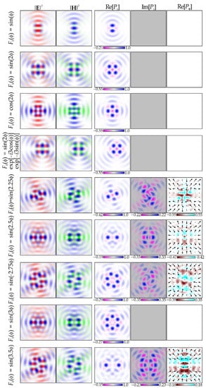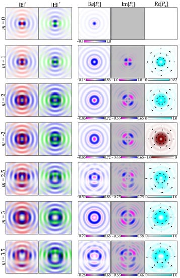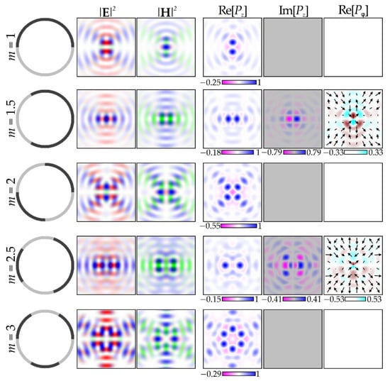 The simulation results for integer m fully correspond to analytical Equations (26) and (28). In particular, the real part of Pz has radial symmetry, and the imaginary part Pz has a structure corresponding to sin(2γ). Fractional orders of m lead to distortion of the mentioned symmetries. However, for Im[Pz], there is complete symmetry of negative and positive values for any m, which leads to a zero mean value of the imaginary part. Nevertheless, locally, it can affect optically trapped Mie particles [,] and for m = ± 1, the local maxima have the greatest value.