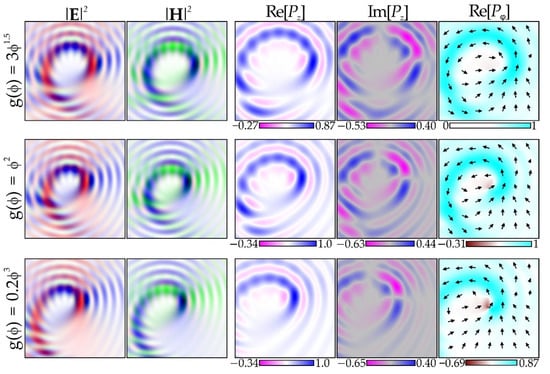 Note that Re[Pz] is the most important for our research, since it allows us to determine the areas of reverse energy flow. In addition, the azimuthal component of the Poynting vector Re[Pγ], which is related to the longitudinal component of the angular momentum, is also interesting [,]: