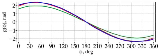 Phase functions: g1(φ) defined by Equation (37) (blue line), g2(φ) defined by Equation (38) (green line), and g3(φ) defined by Equation (39) (red line).