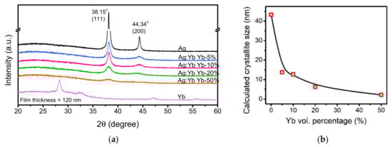 XRD (X-ray diffraction) was performed on samples of Ag and Ag-Yb alloy with different percentage of Yb (Figure 2a). The XRD results show that Ag crystallites becoming progressively smaller with increasing Yb concentration, and, therefore, no Yb crystallization was observed. From Figure 2a, we derived the crystallite size using the Scherrer equation [29,30]: