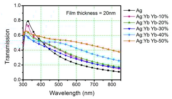 Transmission of Ag and Ag-Yb films; typically, the Ag film has resonant transmission at 320 nm and the transmission drops progressively across the visible range. In contrast, the Ag-Yb film has a weakened resonant at a wavelength of 305 nm, and transmission improves on average by 10% across the visible range.