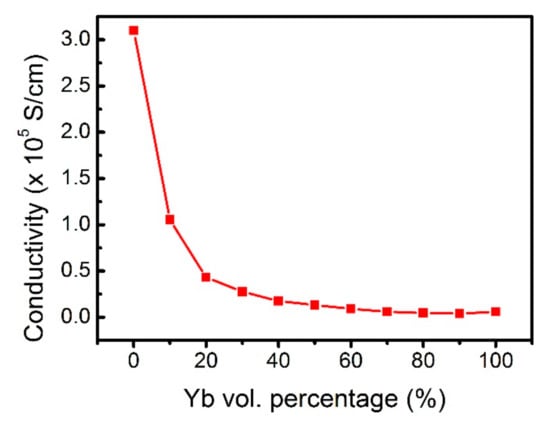 Electrical conductivity of Ag-Yb alloy film as a function of Yb concentration; the presence of Yb in the alloy exponentially reduces the conductivity, reaching a stable value of 0.08 × 105 S/cm at a Yb concentration ≥40%, with a drop of 400× in conductivity.