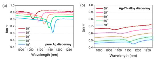 The surface plasmon polariton (SPP) excitation of the pure Ag and Ag-Yb plasmonic nanostructures was determined by angle-resolved ellipsometric spectra (Figure 5a,b). Tan Ψ is the absolute value of the p and s polarization reflectance amplitude ratio between rp and rs, and only p-polarized light excites the SPP. When there is a plasmonic coupling of the incident light with the nanostructure, the reflection intensity of p-polarized light suddenly decreases, while that of s-polarized light remains unchanged. Hence, the SPP excitations are depicted by the dips in Figure 5, which are situated at the infrared (IR) spectral region for both samples. The spacing between each nanostructure is 600 nm; i.e., there is no plasmonic interaction between them. Thus, the spectra in Figure 5 represent the collective response from an individual nanostructure.