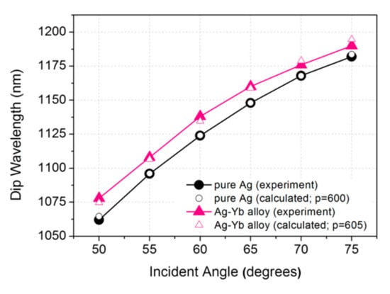 From Figure 5, we can derive the dispersion of the resonant (dip) wavelength as a function of the incident angle. Figure 6 compares the experimental and simulated resonant wavelengths as a function of incident angles. The simulated resonant wavelengths agreed well with the measured values, with an error of ±0.4% after adjusting the period p to 605 nm for the Ag-Yb disk array. We attribute this 5 nm variance to systematic variation in sample fabrication, and it could cause ~10 nm offset of the coupling wavelengths for the alloy device. The result shows that the Ag-Yb alloy plasmonic resonant characteristic still resembles that of Ag. Thus, it is the free electrons from the Ag that contribute most to the plasmonic characteristics.