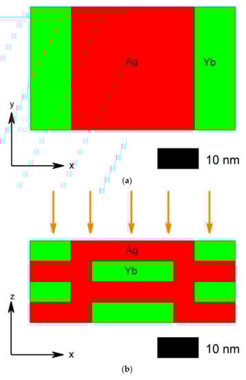 Modelling of the Ag-Yb alloy thin film was carried out by using finite element simulation (Comsol Multiphysics) [31] to elucidate the plasmonic characteristic change due to the mixing of Yb into Ag. In the simulation, the unit cell was composed of composite material of Ag and Yb (Figure 8), where the periodic boundary condition was applied along x, and the incident plane wave was illuminated from the top. The size of the Ag and Yb block was chosen such that the entire system could be described by effective medium theory. We are aware that the structure shown in Figure 8 may not fully represent the real structure, whose mixing can be more complicated. Nevertheless, irrespective of the geometry of mixing, the size of the unit cell, and the effective medium model used, these models should all give qualitatively correct results, as shown in this work. In fact, the dielectric constant of thin film is known to be different from the bulk. Thus, the use of the bulk dielectric constant of bulk silver and ytterbium in the simulation of the thin film is at best a qualitative approach, and, in our case, a good qualitative approach.
