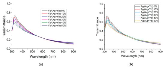For Ag-Yb film, the transmission increased across the visible range. However, the Ag resonance at 320 nm and the Ag-Yb film weakened the resonant peak that blue-shifted to 305 nm (Figure 3). In fact, the Ag resonant wavelength blue-shifted as Yb concentration increased. The transmission of Ag-Yb improved on average by 10% across the visible range in comparison to that of Ag film, and the transmission over the visible range increased with the increase in Yb concentration. However, the electrical conductivity decreased with the increase in Yb concentration. In this work, a 7:3 ratio of Ag:Yb was chosen, as this allowed for an acceptable level of electrical conductivity for potential applications, such as in transparent conducting electrodes, as well as transparency for transmission applications and investigations.