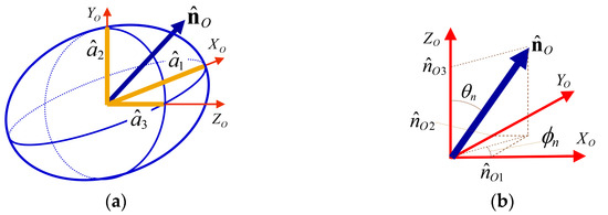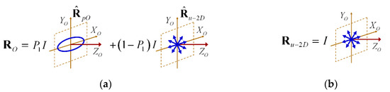 Therefore, from Equations (2) and (4) it follows that a general three-dimensional polarization state admits a simple geometric representation through its associated polarization density object, constituted by the combination of E and , in such a manner that the center of E and the origin of coincide with the point r to which the polarization state corresponds. Thus, both the magnitude of and its relative orientation with respect to E (determined by the intrinsic components , and ) are fixed, in such a manner that the polarization density object has a fixed shape, while its orientation with respect to a given reference frame XYZ involves the three angles associated with the rotation from the intrinsic axes XOYOZO to XYZ.