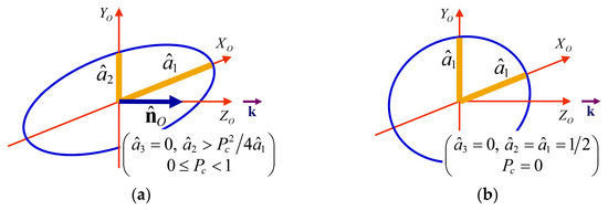 Furthermore, the principal variances can be readily expressed in terms of the pair of intrinsic Stokes parameters and [see Equation (3)]. Leaving aside the intensity, I, which plays the geometric role a scale factor, the polarization density object is defined as the composition of the polarization density ellipsoid (which depends on and ) and , so that the relative orientation of with respect to XOYOZO is fixed and therefore the shape and features of the polarization density object are rotationally invariant.