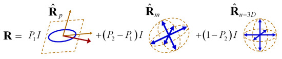 where U is the unitary matrix that diagonalizes R, while and are the indices of polarimetric purity (IPP) defined as [36,37]: