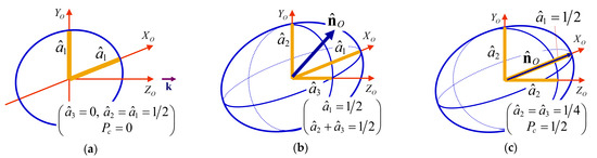 Polarization density object of a pure state : linearly polarized state (a); elliptically polarized state (b), and circularly polarized state (c). The spin density vector of pure states is orthogonal to the variance ellipse and is zero in the case of linearly polarized states.