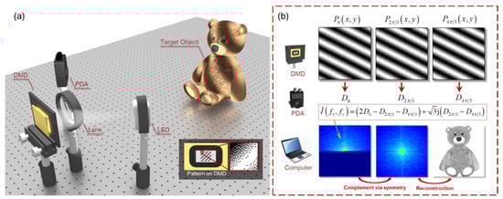 where denotes the coordinate in the spatial domain, denotes the initial phase, and and are spatial frequency corresponding to and direction, respectively. As DMDs are capable of high-speed binary patterns generation, Fourier basis patterns are generally binarized through dithering [33], as the inset in Figure 1a shows. A photodiode amplifier (PDA) is used as the single-pixel detector to collect the back-scattered light from the object under structured illumination. The Fourier spectrum of the desired object image can be acquired by using the three-step phase-shifting strategy, as Figure 1b shows. Each Fourier coefficient, , is acquired by using a set of three Fourier basis patterns of the same spatial frequency pair but a different initial phase. The initial phase, , of the i-th step pattern is . The Fourier coefficient associated with the spatial frequency can be calculated through