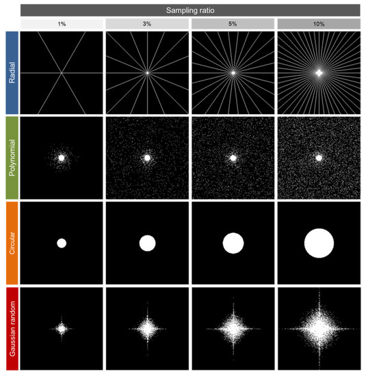 To demonstrate the advantages of the proposed sampling strategy, we compare it with another three methods, including radial sampling strategy [36], circular sampling strategy [31], and polynomial sampling [32]. The methods in comparison are either typically used or recently proposed. Figure 3 shows the sampling masks generated by the aforementioned strategies for different sampling ratios. In particular, the polynomial sampling strategy requires two user-defined parameters, and . The combination of the two parameters, is set to be , , , and for sampling ratios 1%, 3%, 5%, and 10%, respectively. These parameters settings guarantee the best performance of the polynomial sampling strategy in our case.
