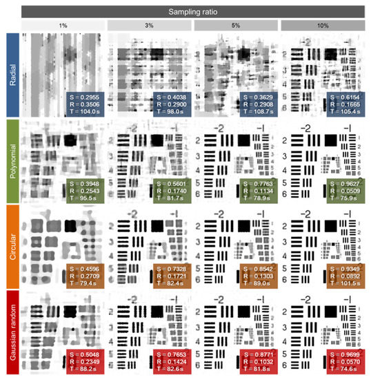 Comparison of the reconstruction results of USAF-1951 resolution test chart for different sampling strategies and sampling ratios. The SSIM, RMSE, and image reconstruction time (denoted by S, R, and T, respectively) are given in the inset of each reconstruction.
