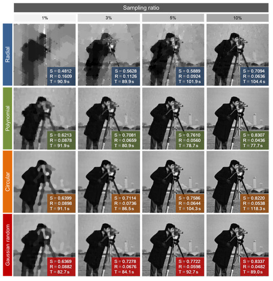 Comparison of the reconstruction results of “Cameraman” for different sampling strategies and sampling ratios. The SSIM, RMSE, and image reconstruction time (denoted by S, R, and T, respectively) are given in the inset of each reconstruction.