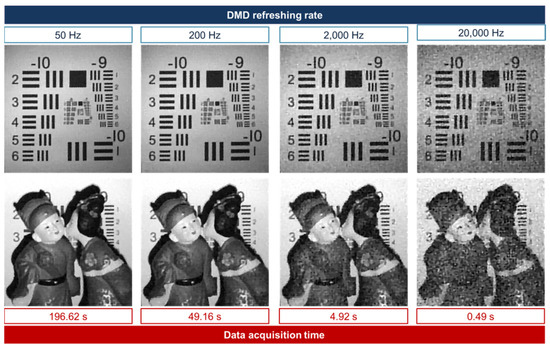 In order to demonstrate the proposed fast single-pixel imaging, we test the proposed method with different DMD refreshing rates. In this test, the sampling ratio is set to 10%, and therefore, the number of single-pixel measurements is 9831. As the results show in Figure 7, the reconstructions for 50 Hz and 200 Hz are clear and without noticeable noise. In other words, the proposed method is able to capture a high-quality image of 256 × 256 pixels within 50 s. As the DMD refreshing rate increases, the noise becomes obvious and the signal-noise ratio (SNR) decreases. The image for 2000 Hz is slightly noisy, but the data acquisition time can be reduced down to 5 s. When the DMD refreshing rate is 20,000 Hz, the image appears noisy, but the objects in the image are still recognizable.