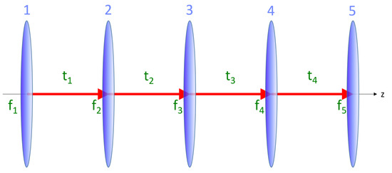 Simplified scheme for the five lenses system. is the focal distance of each lens, and the distances between two lenses.