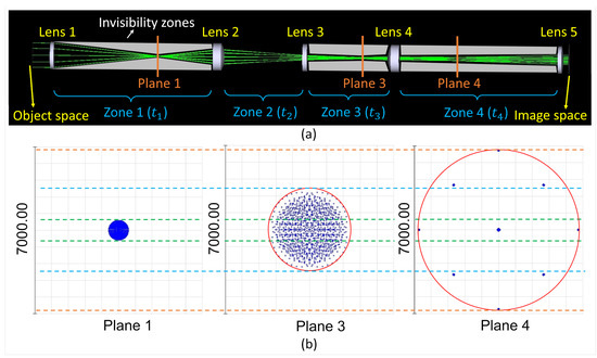 Simulation results of Case mm. (a) Ray tracing for the case mm. We can see the zones of invisibility and the planes used to calculate the diameter of the beam at the points of maximum invisibility. (b) Spot Diagram for the three planes of interest using the same scale to compare the sizes.