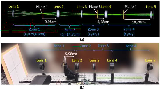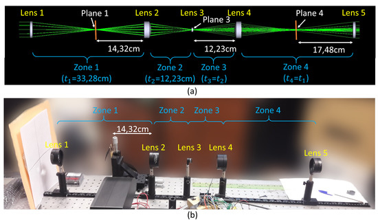 Case with mm. (a) Scheme of the ray tracing of the considered system, including the distances between the lenses and the relative position of the invisible planes. (b) Picture of the experimental system for the case mm.
