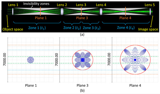 Following the same procedure as before, the numerical simulation of the ray tracing of this case is shown in Figure 5a. The ray concentration is clearly observed in the spatial regions between lenses 1 and 2 (plane 1) and lenses 4 and 5 (plane 4), providing two invisible regions. There is a third concentration point (plane 3), but it is located just at the position of lens 3. Thus, it is unpractical experimentally. Nevertheless and following the same procedure as before, Figure 5b shows the spot diagram in each plane, including plane 3. The scale is the same to allow a direct comparison.