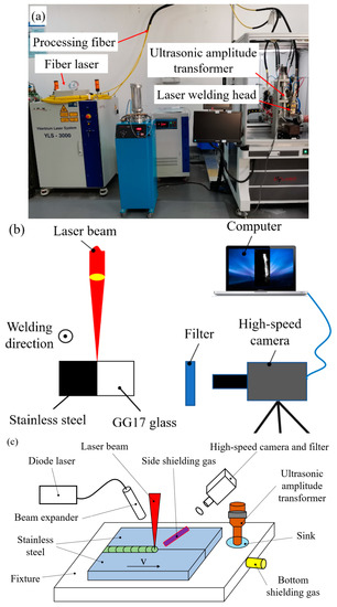 The welding materials used were 304 stainless steel plates of 3 mm in thickness. Table 1 overviews the substrate with respect to its chemical composition. The modified sandwich sample comprises, as displayed in Figure 1b, one sheet of stainless steel and one sheet of GG17 glass, both with a size of 50 mm × 3 mm × 3 mm [22]. The processing parameters for the laser welding experiments are presented in Table 2.