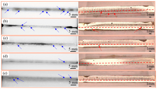 The X-ray nondestructive inspection and longitudinal sectional view of weld seams at different ultrasonic powers are shown in Figure 2. The parameters of laser welding included the laser power of 2000 W, welding speed of 20 mm/s and defocus of +3 mm. Nitrogen was used as the shielding gas, with the flow rate of 20 L/min, the angle of 30° between the shielding gas nozzle and laser beam and the ultrasonic power of 0, 250 W, 500 W, 750 W and 1000 W. Bottom porosities are defined as those located within the depth of 1 mm at the bottom of the weld seam. Figure 2 indicates the maximal total porosities are obtained without ultrasonic vibration, as shown by the blue arrows in Figure 2. The porosities are distributed at the upper, middle and lower parts of the weld seam, with three bottom porosities, as shown by the red arrows in Figure 2. The total and bottom porosities both decrease at the ultrasonic power of 250 W and 500 W. The most significant suppression with one pore in total is achieved as the ultrasonic power increases to 750 W. Only a few pores are observed near the upper surface of the weld seam, without bottom porosities. When the ultrasonic power continues to increase to 1000 W, the total number of porosities increases to four. The porosities are found at the middle and upper part of the weld seam, without bottom porosities. Therefore, it can be concluded that the potential of having fewer porosities is obtained by the application of ultrasonic vibration with a critical value of ultrasonic power.