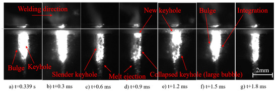 The dynamic change process of the keyhole and weld pool in ultrasound-assisted laser welding of “sandwich” specimens is provided in Figure 4. An obvious bulge is observed at the keyhole’s rear wall, with a narrow outlet of the keyhole at t = 0. 339 s (Figure 4a). The brightness inside the keyhole increases sharply, and the keyhole elongates downward, with a smaller bulge in the keyhole’s rear wall at t + 0. 3 ms (Figure 4b). Subsequently, the outlet of the keyhole opens, with the molten metal spraying downward and the diminution of the keyhole (Figure 3c). At this moment, the keyhole is prone to collapse, since the steam pressure inside it drops significantly (Figure 4d). Hereafter, a new keyhole is formed under the action of continuous laser-beam energy, and the newly formed keyhole is bright (indicating relatively concentrated energy inside) and gradually moves down (Figure 4d and Figure 4e, respectively). As the welding process progresses, the newly formed keyhole develops downward and fuses with the collapsed one, with an obvious local bulge at the rear wall of the fused keyhole (Figure 4f). Afterward, the outlet of the keyhole opens, with the molten metal spraying downward and the disappearance of the local bulge at the keyhole’s rear wall (Figure 4g).