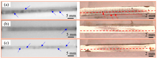 The X-ray nondestructive inspection and longitudinal sectional view of weld seams at different welding positions are displayed in Figure 5. The porosities in the X-ray nondestructive inspection and the bottom porosities in the longitudinal section are shown by the blue and red arrows, respectively. As indicated in Figure 5, the total number of porosities declines in horizontal position welding, vertical up welding and vertical down welding, compared with flat welding (Figure 2a). Among them, the largest total number of porosities is obtained in vertical up welding, with some bottom porosities (Figure 5a). The optimum suppression of porosities is achieved in vertical down welding, without bottom porosities (Figure 5b). The porosities in horizontal position welding are fewer than those in flat welding, as indicated in Figure 5c. The results indicate that the potential of having fewer porosities is achieved with the welding position of vertical down welding.