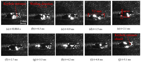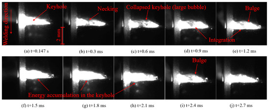 The dynamic change process of the keyhole and weld pool in vertical down laser welding of “sandwich” specimens is given in Figure 6. As shown in Figure 6, the fluctuation of the keyhole in vertical down laser welding is smaller than that in conventional laser welding. The shape of the keyhole is stable with great brightness inside at t = 0. 147 s (Figure 6a). Subsequently, the bottom of the keyhole necks down and collapses successively (Figure 6b,c). Soon afterward, the keyhole moves deep to the bottom again, with a complete new keyhole formed (Figure 6d,e). With the progress of welding, laser energy accumulation is found successively at the middle and middle-upper parts of the keyhole, accompanied by a local bulge in the keyhole’s rear wall but without collapse, as demonstrated in Figure 6f–j.