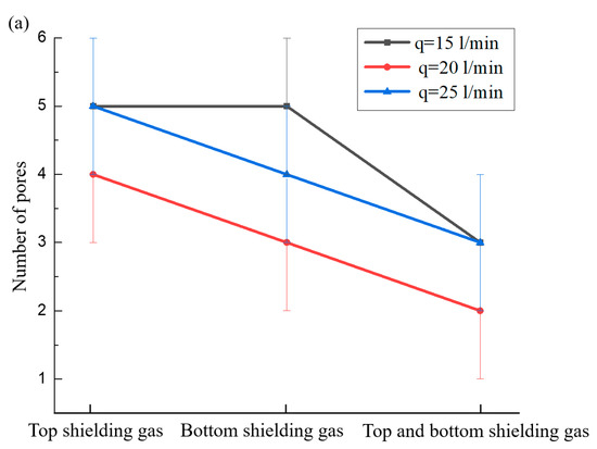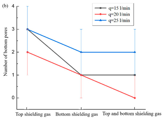 The effects of flow rate and supply method of shielding gas on the total and bottom porosities are illustrated in Figure 7. The highest number of total and bottom porosities is caused when only top shielding gas is applied, as shown in Figure 7a and Figure 7b, respectively. Compared with top shielding gas alone, the total and bottom porosities both decrease when only bottom shielding gas is applied, as shown in Figure 7a and Figure 7b, respectively. The lowest number of total and bottom porosities is found when the top and bottom shielding gases are both applied, as shown in Figure 7a and Figure 7b, respectively. No bottom porosity is formed occasionally at the flow rate of 20 L/min, as shown in Figure 7b. The results indicate that the potential of having fewer porosities is obtained when the top and bottom shielding gases are both applied with a moderate flow rate.