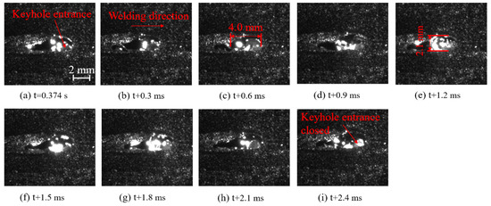 The high-speed photograph of the upper-surface weld pool and entrance of the keyhole during laser welding without shielding gas is demonstrated in Figure 8. Figure 9 provides the high-speed photograph of the upper-surface weld pool and entrance of the keyhole when top and bottom shielding gases are applied simultaneously. As indicated in Figure 8, without shielding gas, the length of the upper-surface weld pool is about 4.0 mm, with a width of about 2.1 mm, and the opening and closing cycle of the entrance of the keyhole is about 2.4 ms during laser welding. The length of the upper-surface weld pool is about 7.2 mm, with a width of about 2.6 mm, and the opening and closing cycle of the entrance of the keyhole is about 5.1 ms, when top and bottom shielding gases are applied simultaneously. Compared to the case without shielding gas, the length and width of the upper-surface weld both increase, with the stability-maintaining time of the entrance of the keyhole prolonged, when top and bottom shielding gases are applied simultaneously. Therefore, the increase in the volume of the weld pool and improvement in the stability of the keyhole guarantee fewer bubbles caused by the collapse of the keyhole, when top and bottom shielding gases are applied simultaneously. Despite the bubbles formed, the larger weld pool provides the bubbles with a longer time to escape upward, and thus the porosity defects at the bottom of the weld seam are better improved.