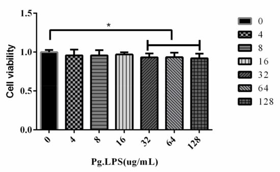 HGFs were cultured in a medium containing LPS for 24 h. Over 32 μg/mL LPS could reduce the cell viability (p < 0.05), 16 μg/mL LPS had no significant effect on the cell viability. * p < 0.05.