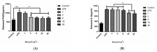 After HGFs were incubated in the presence or absence of LPS and PBM for 24 h, the concentration of PGE2 and IL-8 in cell supernatant was measured. Figure 3A shows the results compared with the control group. The cells in the LPS group had a significant increase in the production of PGE2 under the stimulation of LPS (p < 0.001). The PBM treatment with a dose of 3, 9, 18, and 36 J/cm2 could inhibit the production of PGE2 in HGFs stimulated by LPS (p < 0.01). The irradiation with dose of 1, 3, and 9 J/cm2 had no significant effect on inhibiting the production of IL-8 in HGFs (p > 0.05).