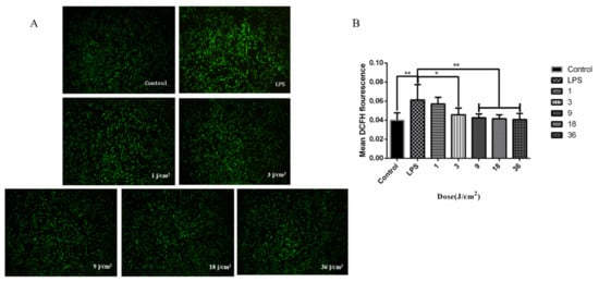 The effects of irradiation with doses of 1, 3, 9, 18, and 36 J/cm2 on ROS production in HGFs induced by LPS. (A) Immunofluorescence of cellular reactive oxygen species. (B) Statistical analysis of the average fluorescence intensity of reactive oxygen species. * p < 0.05; ** p < 0.01.