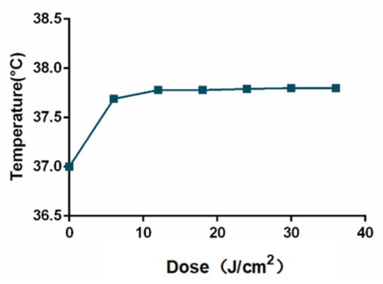 Figure 5 shows the results under the condition of light intensity (5 mW/cm2). As the light dose increased, the temperature in the medium increased slightly and remained at about 37.4 °C ± 0.4 °C, the temperature changed within 1 °C. Our previous studies have demonstrated that the effect of light on cells is not caused by changing the temperature of the culture medium []. This result also demonstrated that the inhibitory effect of PBM treatment on the inflammation of human gingival fibroblasts was independent of changing temperature.