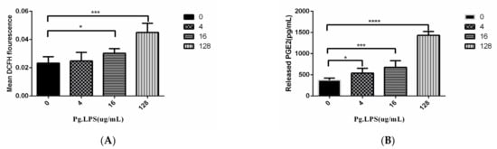The effects of the concentration of LPS on ROS and PGE2 production in HGFs. (A) The effect of different concentrations of LPS on the ROS in HGFs, (B)The effect of different concentrations of LPS on the production of PGE2 in HGFs. * p < 0.05; *** p < 0.001; **** p < 0.0001.