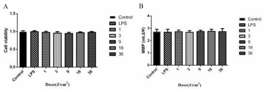 There was a study finding that low-dose LED PBM could significantly stimulate tissues and cells such as: accelerating wound healing, promoting cell proliferation and differentiation, etc. []. Wang et al. found that 660 nm red light (3.5 mW/cm2) irradiation with dose of 20 J/cm2 could significantly promote the proliferation of rat gingival fibroblasts []. However, in this study, we found that 630 nm PBM with doses of 1, 3, 9, 18, and 36 J/cm2 had no significant effect on cell viability of HGFs (Figure 7A), which demonstrated that the inhibition of cell inflammation by PBM had nothing to do with changing cell viability, Chang et al. also found that there was no significant change in cellular proliferation in the PBM group (660 nm at energy densities of 5, 10, and 15 J/cm2) []. Mitochondria are the main sites of intracellular ROS production. High levels of ROS will damage the mitochondrial membrane, reducing the respiration efficiency of mitochondria and the production of intracellular ATP. It will then produce more ROS through a series of reactions, which ultimately results in a decrease in MMP. When the MMP is low, JC-1 mainly exists as monomer with green-fluorescent. When the MMP is high, JC-1 mainly exists as aggregates with red-fluorescent; thus, the mitochondrial membrane potential can be measured by the relative ratio of red-green fluorescence []. Mitochondrial function is impaired, which is an early marker event of apoptosis [,,]. In this study, we had studied the effects of different doses of PBM on the MMP of LPS-treated HGFs. Figure 7B shows that 16 μg/mL LPS and irradiation with doses of 1, 3, 9, 18, and 36 J/cm2 had no significant effect on the mitochondrial membrane potential of HGFs, which means 630 nm red light PBM is a harmless method for inhibiting inflammation.