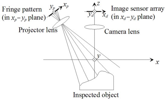 Figure 1 shows the optical configuration of the profile measurements. A set of binary-encoded fringe patterns that were used to perform the phase-shifting technique were employed as the input signals to the digital projector. With a projector lens, these patterns (located on the xp–yp plane) were sequentially mapped to the inspected object positioned in the (x, y, z) coordinates. The fringes on the object were recorded using a CCD camera, in which the recorded images were focused on the xd–yd plane.