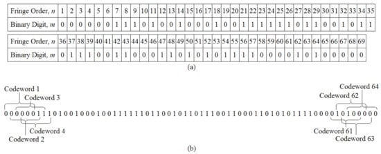 (a) A list of the fringe order n with the corresponding binary digit m. (b) An illustration depicting that the stream of binary digits was formed by assembling 64 codewords.