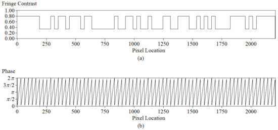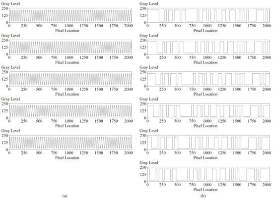 Based on Equation (3), all the fringe’s maximum gray levels were 225, but the local minimum gray levels were quantized into two levels, 25 and 113. Consequently, the fringe that is projected on the inspected object can be recognized as a “0” or “1” digit by evaluating either the local minimum gray level or the contrast ratio. Figure 2a shows a list of the fringe orders n with assigned binary digits m. Such an arrangement caused the five fringe patterns to be labeled with a long stream of binary digits, as shown in Figure 2b. In this stream, any six adjacent digits formed a codeword. Each codeword took place once in the entire stream. Based on the permutation rule, a total of 64 codewords (i.e., 26 = 64) were created. Hence, a stream of 69 digits was produced (i.e., N = 69). Figure 3 shows the 1D gray-level distributions of the five binary-encoded patterns. Their 1D contrast distribution and phase distribution wrapped in the interval (0, 2π] are illustrated in Figure 4a,b, respectively. At the boundaries between the “0”- and “1”-encoded fringes, the changes in the DC gray levels and contrast ratios caused the gray-level distributions to be discontinuous, as the circled areas shown in Figure 3. By contrast, the gray-level distribution of the first encoded pattern (i.e., k = 1) was continuous because all the fringes’ maximum gray levels (with the same value of 225) were coincidentally located at the boundaries.