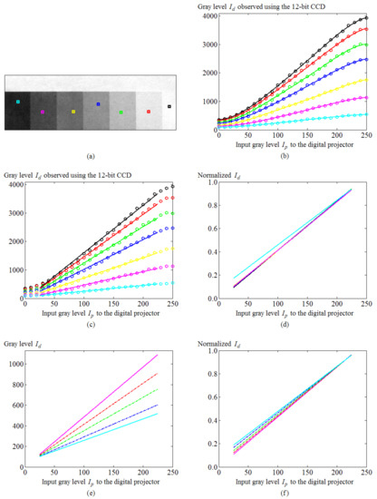 In our system, the digital projector Epson EB-U04 (with a resolution of 1920 × 1200) and the 12-bit CCD camera PCO pixelfly qe (with a resolution of 1392 × 1024) were employed to perform the tasks of pattern projection and image acquisition, respectively. To evaluate the linearity between the input gray level Ip (to the digital projector) and the gray-level Id (recorded by the digital camera), a screen that was textured with various reflection coefficients, as shown in Figure 5a, was selected as the inspected object. The digital projector successively illuminated the screen with various input gray levels Ip. Each illumination on the screen was sequentially recorded by the CCD camera with a given exposure time and a given lens aperture. Figure 5b shows the obtained data sets and fitted curves for the sampled pixels illustrated in Figure 5a. The correspondences between the input and the observed gray levels contained nonlinear errors. A couple of methods were presented to cope with the linear distortion [24,25,26]. Here, we simply confined the input gray level Ip within the range from 25 to 225 to sustain the linearity. Figure 5c shows the fitted relationships in the linear area. They can be simply described as