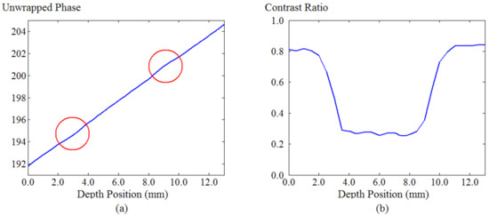 The task of phase extraction and unwrapping was repeated as the plate was positioned at various depth positions (i.e., z = z0, z1, …, zi). Hence, a phase-to-depth correspondence for each image pixel was obtained. The correspondence between the contrasts and depth positions for each pixel was identified as well. Figure 7a,b illustrates such correspondences for one selected pixel. To provide a close-up view, only the depth position ranging from 0.0 mm to 13.0 mm is plotted. Two boundaries between the “0” and “1” fringes were observed by the image pixel as the flat plate was moved to z = 3.0 mm and 9.6 mm, respectively. Hence, the phase-to-depth correspondence fluctuated in the circled areas shown in Figure 7a. Meanwhile, a change in contrast was observed in the same depth regions, as shown in Figure 7b.